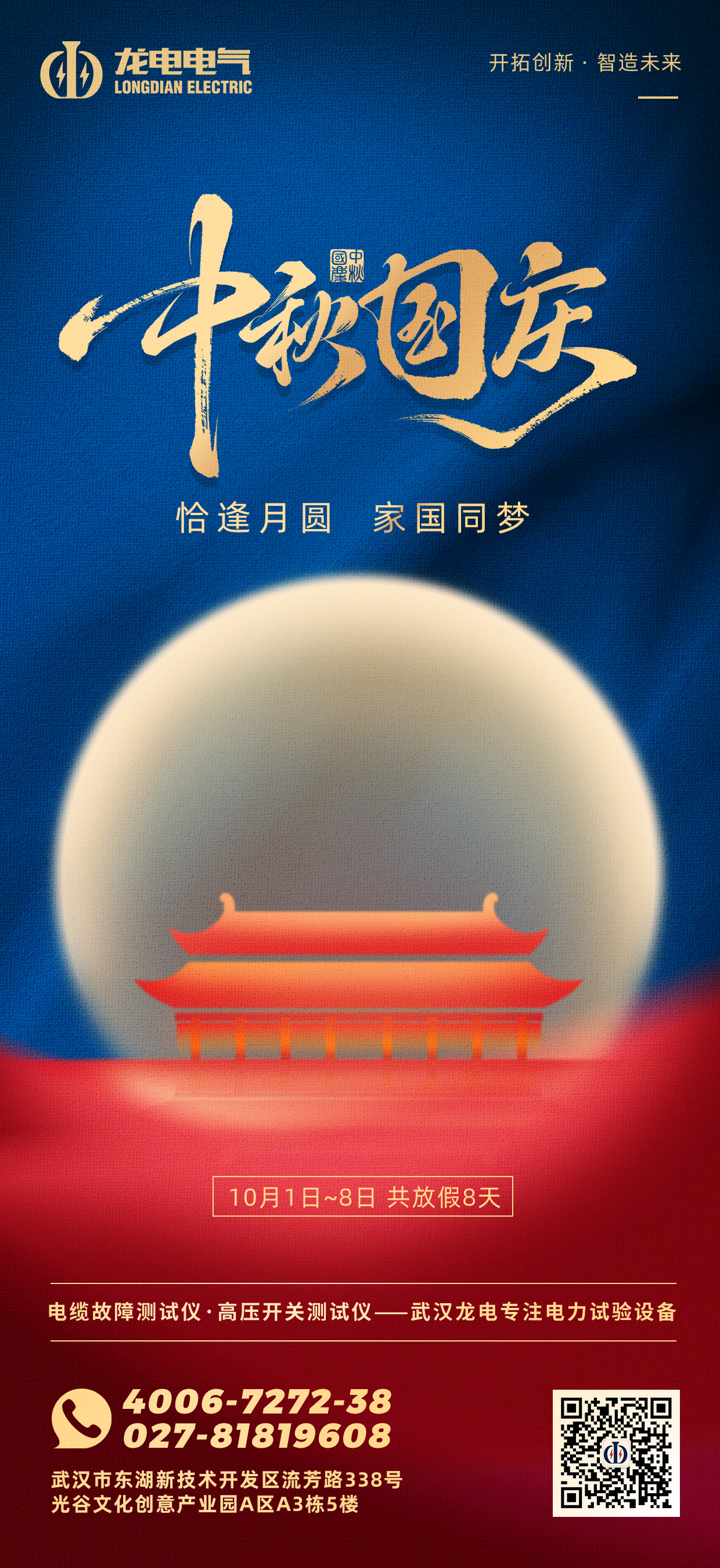 秋色宜人,月圓情濃。值此中華人民共和國成立76周年華誕暨傳統(tǒng)中秋佳節(jié)來臨之際,武漢市龍電電氣設備有限公司全體員工向您致以最誠摯的節(jié)日問候與祝福!